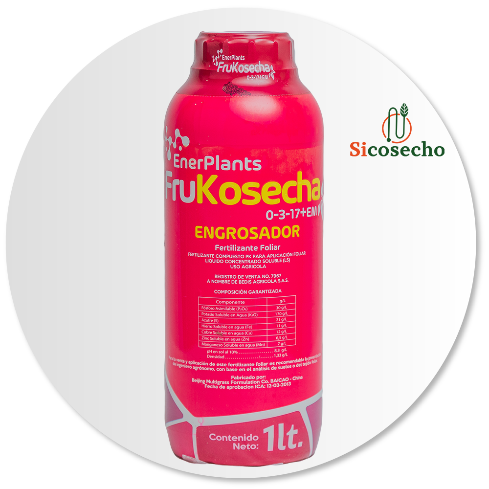 Es un fertilizante foliar líquido altamente concentrado en P y K enriquecido con aminoácidos y un complejo hormonal que le permite transferir a la planta toda la energía necesaria en épocas de engruese, cuajado y llenado de frutos.